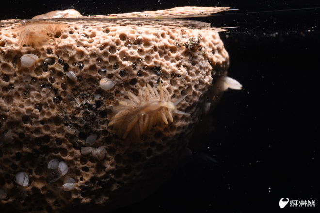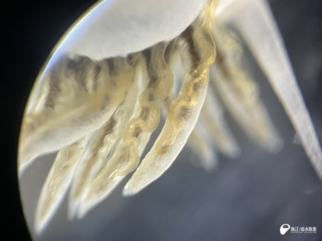今回展示しているヒダミノウミウシは、えのすいの目の前の砂浜で、大量のギンカクラゲと共に漂着し、採集されました。みのが青色ではないため、おそらく採集された際に同所で付着していたエボシガイの仲間を食べて生活していたのだと考えられます。めずらしい種ではないようですが、水族館での展示例や飼育例は非常に少ないです。ぜひこの機会にご覧ください。