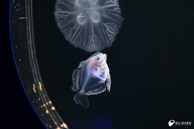 ハナビラウオは、深海の海底を主な生息場所としていますが、一生を通した生態や生活史などについての詳細はまだ明らかとなっていません。 しかし、幼魚の時期に表層を漂うクラゲに身を寄せて過ごすことが知られています。 成魚は、比較的近縁種であるメダイ(“えのすい” の相模湾ゾーンにいます)に似た姿ですが、幼魚のうちは半透明で花びらを思わせる姿をしています。 今の時期だけ見ることができる「クラゲ」と「花びら」が寄り添う姿をぜひご覧ください。
