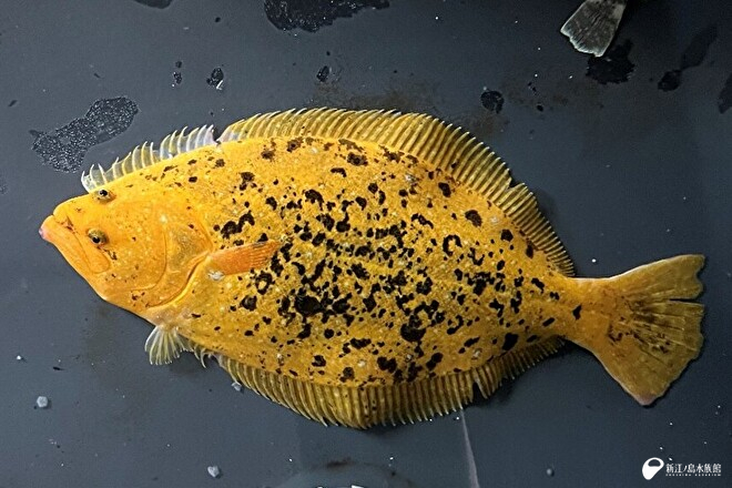 ヒラメは黒色素胞、黄色素胞、虹色素胞の 3種類の色素胞を組み合わせて、周囲の環境に隠れられるよう体色を変化させます。しかし、この個体は一部色素胞に異常があり、黄色の部分の割合が多くなっています。本来、自然界では海底に擬態し、獲物を待ち伏せしたり、外敵から身を守ります。黄金の体は獲物からも外敵からも見つかりやすく、生き残ることは困難と考えられています。