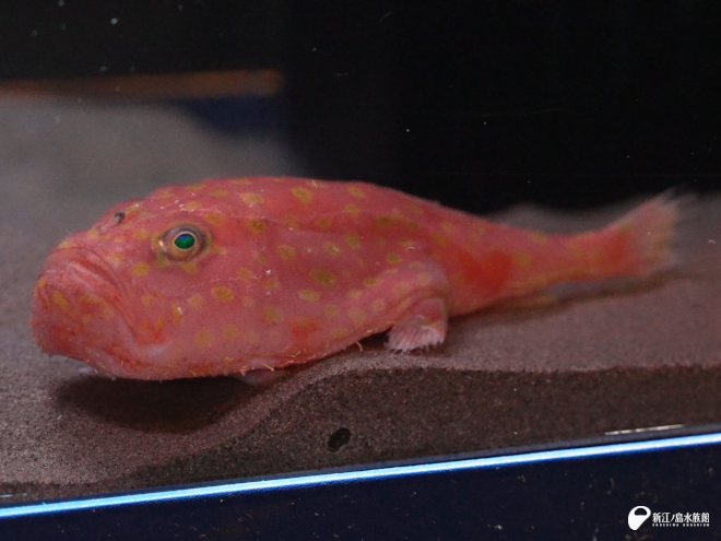 平たい卵型の体で海底をぽてぽて歩きまわり、疑似餌のような小さな誘引突起を使って、餌となる小魚やエビを誘います。 全身が小さなとげで覆われ、多数の緑色の斑点があり色鮮やか。
