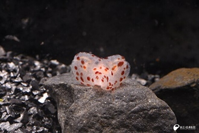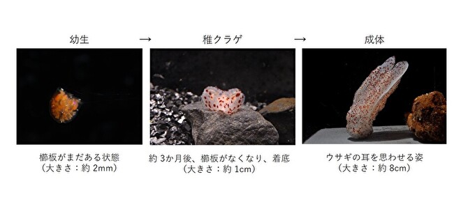 生まれたばかりのコトクラゲは、他のクシクラゲ類(カブトクラゲなど)と同様に櫛板を持ち、浮遊生活をおこないます。その後、成長に伴い櫛板はなくなり、着底、おとなの姿へと変化していきます。稚クラゲは、まだウサギ耳とはいかず、ハート型をしています。今しか見られない愛らしい姿と今後の大きな成長がとても楽しみです。