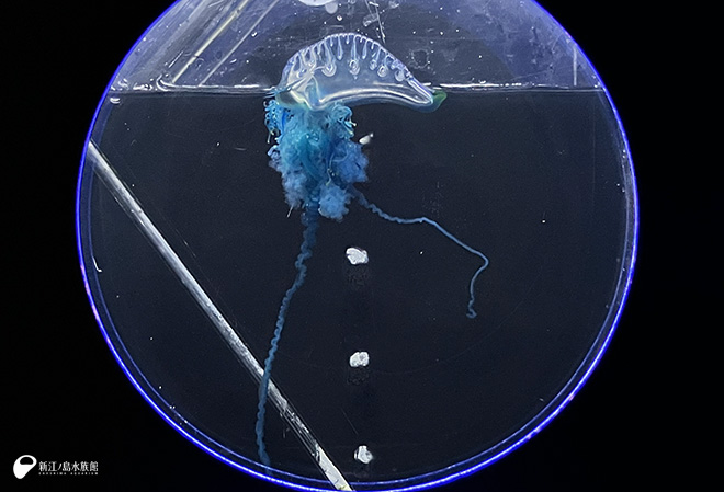 青く美しい烏帽子状の気泡体(浮き袋)が特徴で、風に吹かれて移動します。 役割の異なる個虫によって群体が形成されています。 触手はとても長く、強烈な毒をもつ危険なクラゲで、通称「デンキクラゲ」とも呼ばれます。