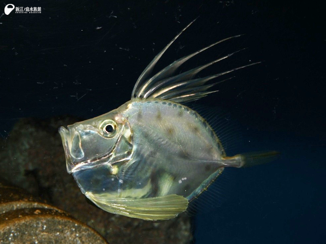 北海道から九州の沿岸域に分布しており、春先には相模湾の定置網で幼魚が漁獲されます。体表の光沢とその平たい姿は、まさに和名そのもののように、鏡そっくりです。 また、とてもデリケートな魚で、少しでも水面から上に上げると、弱ってしまうこともあります。定置網に入った個体も、全て生かせるわけではなく、水槽内で展示しているのは、他の魚にぶつからないよう、また空気中に上げないように慎重に採集した個体です。 餌を食べる姿はとてもユニークで、口が伸び、まるで太いストローのように海水ごと獲物を吸い込みます。