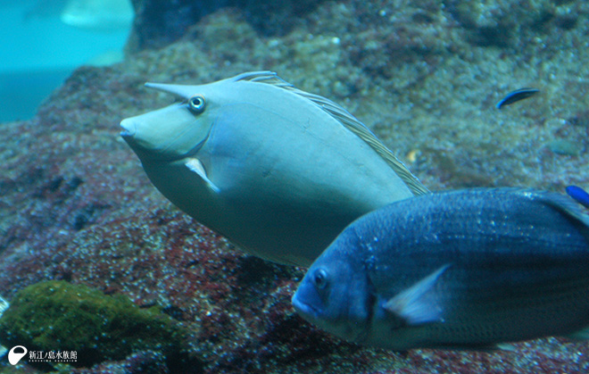 ここにテングハギの若魚がいます。体長 30cmほどの灰色の平べったい魚で、おでこがちょっと出っ張った変わった顔をしています。実は大水槽側にはテングハギの成魚もいるのですが、すぐに同じ魚だとわかる方はほとんどいらっしゃらないのではないでしょうか。