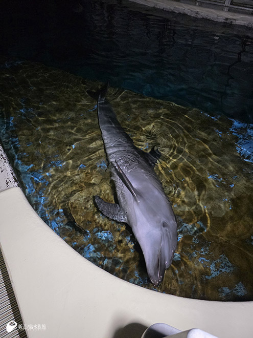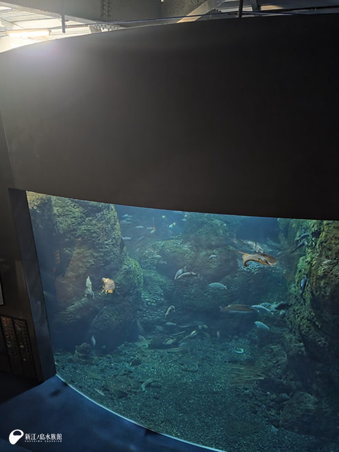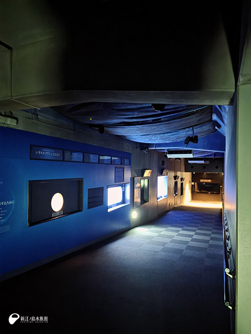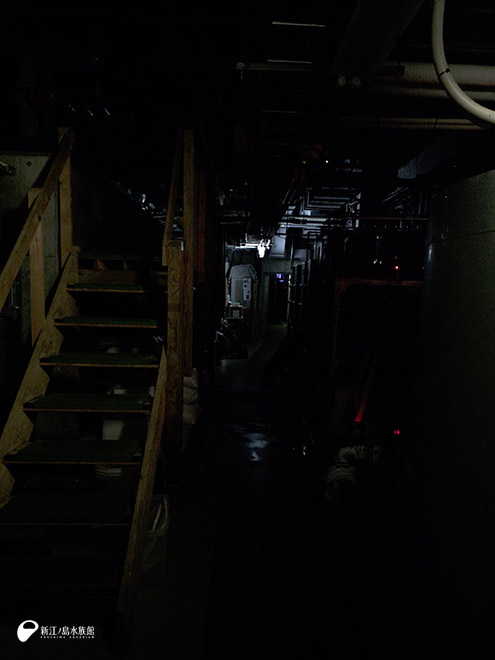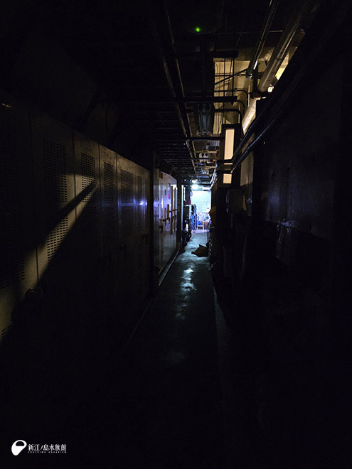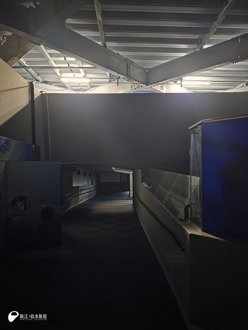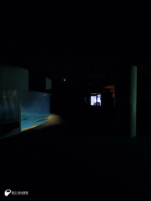 太平洋のサメ水槽前は真っ暗ですが、サメ水槽から明かりがこぼれます。