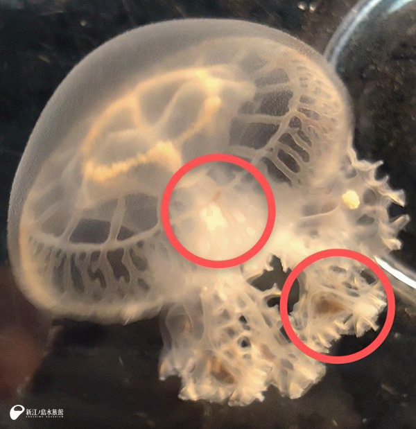 2~3mmのエフィラ幼生の頃は、乳白色で特に赤色は見えません。 傘の大きさが1cm近くなってくるとだんだんうっすらと傘の縁と口腕に色が見え始めます。 それからどんどん成長に合わせて、赤色が鮮やかになり、傘の縁の赤ラインもクロスのように見えてきます。