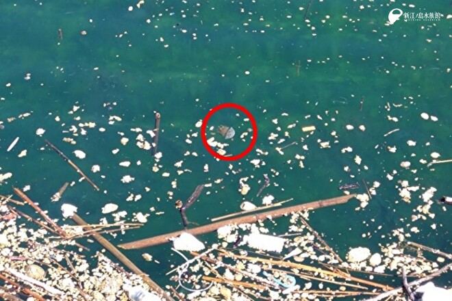 火山由来の軽石がたくさん浮いている中、ぴょこぴょこと泳いでいました。