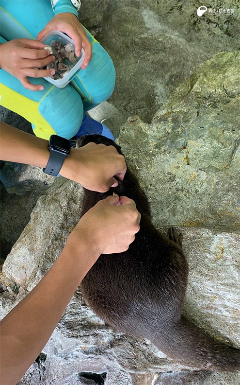 最初は触られた方に振り向いていましたが、獣医師やアルバイトスタッフに手伝ってもらい、触られても落ち着いて魚を食べられるようになりました。