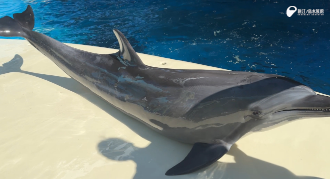 ワクチン接種自体はほんの数十秒の短い処置ではあるのですが、今回のようにイルカにも協力してもらって処置をする場合には、長い時間をかけて練習しています。まずは陸上に上がること、上がったままでいること、人が近づいてからだを支えられていても気にしないこと… などなどができることが必要になります。それに加えて、ある程度の刺激がある「針を刺すこと」に対しても、まずは軽く触られることから始め、指圧、爪、氷、爪楊枝など、段々と本番の針での刺激に近づけていって、それらも「大丈夫だよ」という状態に「ニコ」がなれば、はじめて本番に臨むことができます。
