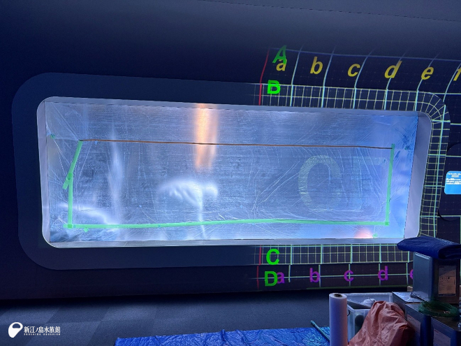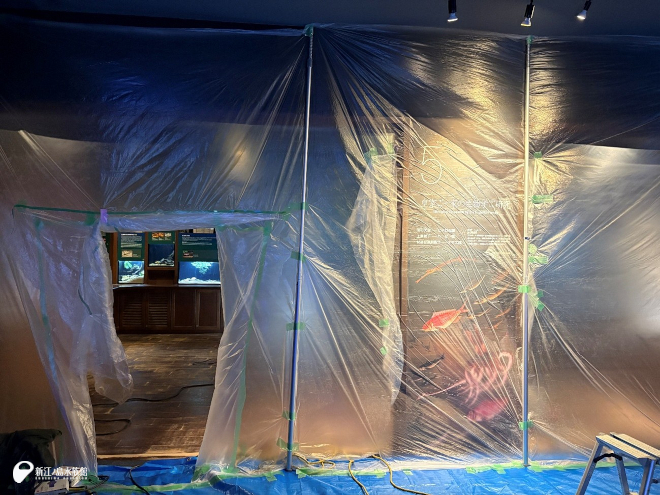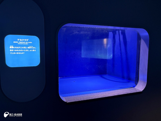 大きな水槽の内側壁面の塗装とプロジェクターの点検をおこなっています。いつも水槽内にいる生き物たちはこの期間はバックヤードにお引越しです。