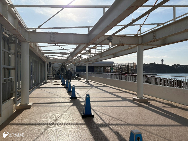 イルカショースタジアムに向かうオーシャンデッキのリニューアル工事をおこなっています。ネットが無いととても明るく感じます。
