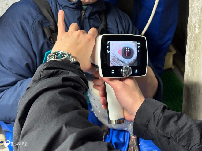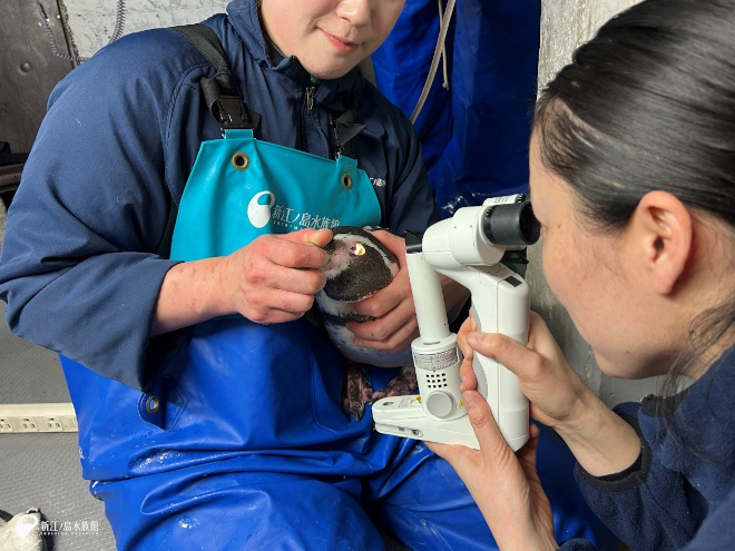 光を当てたり、カメラのような機械で目を撮影したり、ペンギンたちにも協力してもらいながら検査をおこなっていきます。ペンギンも高齢になると白内障になりやすく、毎年眼科検診をおこないそれぞれの個体の目のようすを確認します。