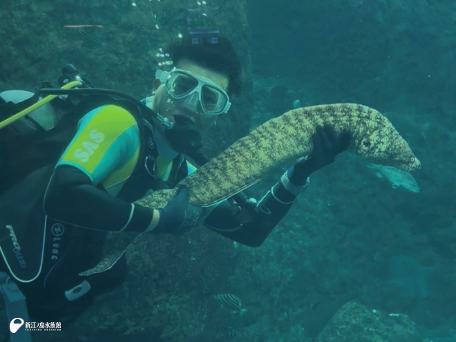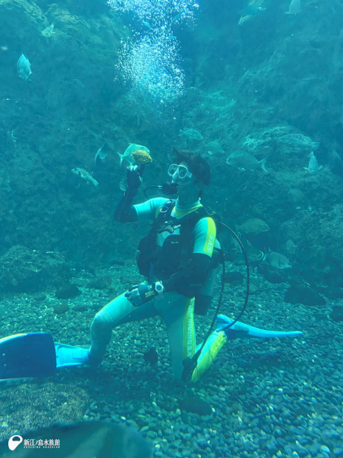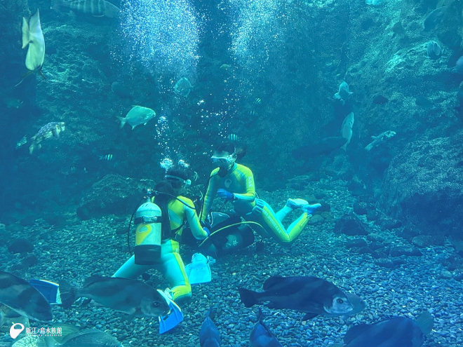 こちらでは、水槽の展示替えをおこなっています。トリーターが水槽内に入り、擬岩やサンゴの配置換えとお掃除をおこなっているところです。小さな水槽なのでタンクなどは背負わずトリーターの息が続く限り潜り続け、それを何度も繰り返します。