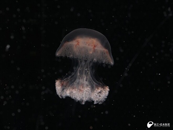 タイトルにある、赤い十字架をもつクラゲ、レッドクロスジェリーこと、リクノリーザ・マライエンシスがクラゲファンタジーホールの入口 円柱水槽に登場しています。