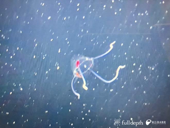 そのクラゲの写真は、昨年の 2月に相模湾で水中ドローンを使った深海生物調査をおこなっていた、株式会社FullDepth の伊藤さんと杉村トリーター、八巻トリーターたちから送られてきたものです。