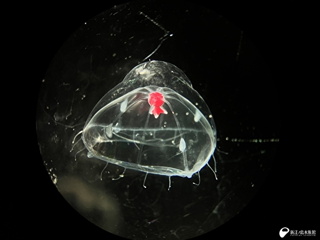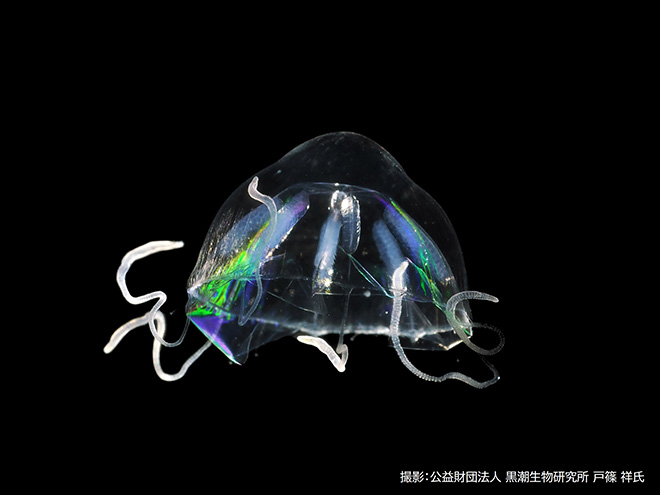 そして、日本でも出現することが分かった T. erythrogaster に「ホムラツノガサクラゲ」という新たな和名を付けさせていただきました。本種の傘の形が日本の伝統的な笠である「角笠(つのがさ)」に似ていることから、また、燃えるように赤い口柄が、暗い深海で揺らめく「焔(ほむら)」を思わせることからこの名前を選びました。