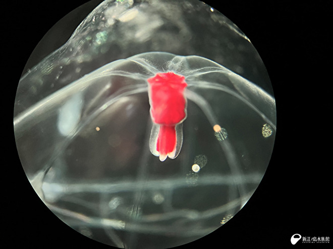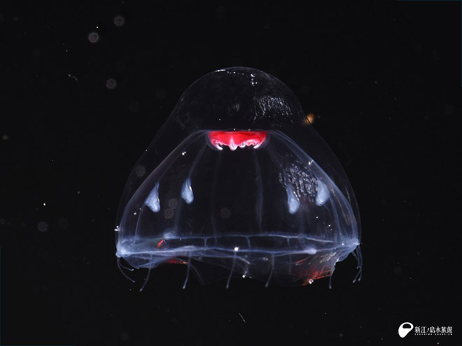 なんだこれ!!?? 長い触手を 4本持ち、口の部分と思われる真ん中が嘘みたいに赤いクラゲ。こんなの今まで見たことない…。私にとっても「なんだかわからないクラゲ」すぎました。