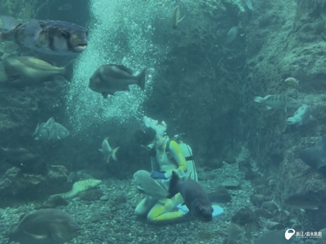 相模湾大水槽では毎日「えのすいトリーターとさかなたちのふれあいタイム(以下「ふれあいタイム」)」というショーをおこなっています。私たちトリーターが相模湾大水槽でくらしている魚たちと一緒に泳いだり、遊んだり、時にはいちゃいちゃ(?)したりするようすをみなさまに見ていただくショーなのですが、その中で、最近私が大注目している 2匹の魚たちがいます。マハタの「ヘプタン」とツチホゼリの「ゴマシオ」です。