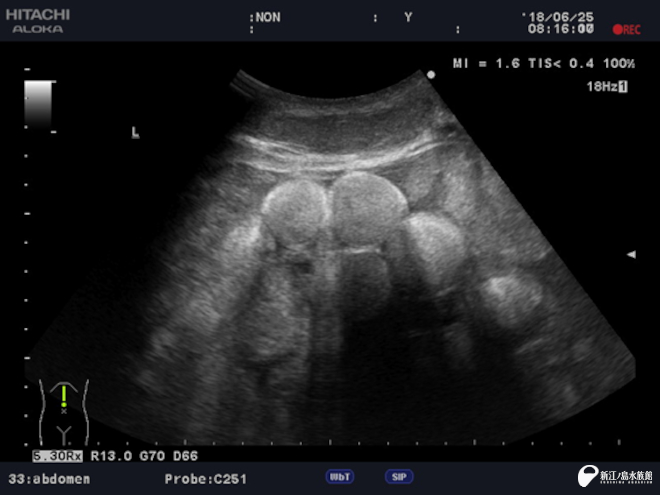 2018年 アオウミガメ「ノンキ」の卵胞エコー。丸く映っているのが卵胞です。