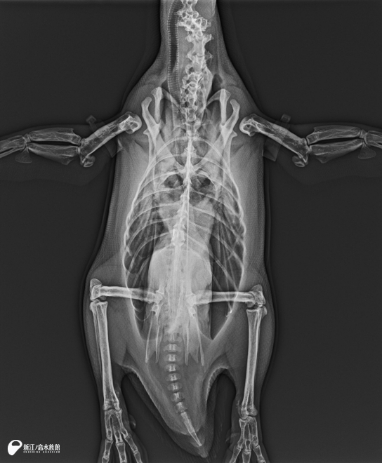 2025年 フンボルトペンギン「コメ」全身レントゲン。内臓の大きさの変化や膝や股関節の関節炎の進行具合などを観察し、この体勢以外に他 4方向から撮影します。15歳以上の高齢ペンギンは年に 2回、それ未満のペンギンたちは年に 1回の検査を実施しています。