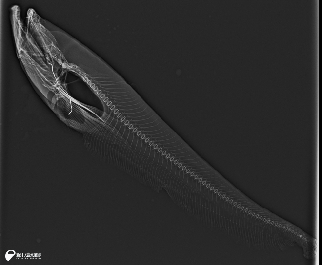 2025年 パービャウ(淡水魚)のレントゲン。なぜパービャウのレントゲンを撮ったのか… この画像をじっくり見れば分かる人もいるかも。実はこの時、給餌に使う棒の針金を飲み込んでしまい、急遽レントゲンを実施しました。レントゲン写真にはしっかりと針金が写っています。幸い、口を開けたところで止まっていたのでピンセットで取り除き、無事に水槽に戻りました。