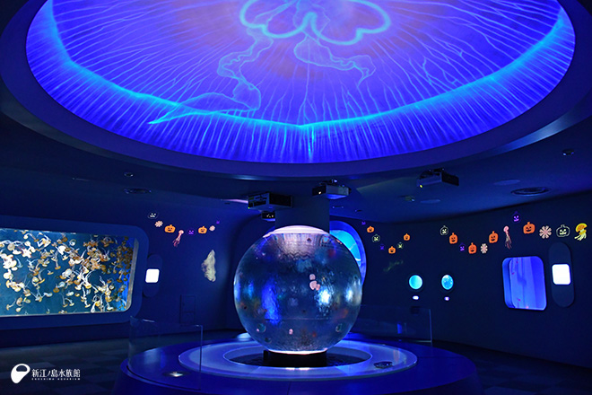 ハロウィン装飾を施した季節限定のクラゲファンタジーホール。幽霊のようにゆらゆら壁面を漂うユウレイクラゲにもご注目!