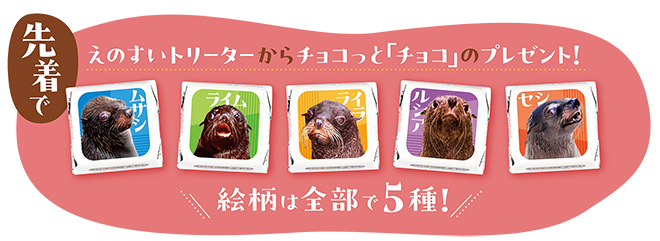 5日間限定の「アシカとチョコっとさんぽ」。会場では各日先着100名さまに、えのすいトリーターからチョコっと「チョコ」をプレゼントします。
