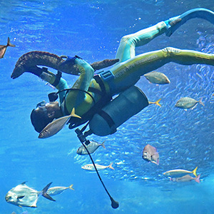 岩場にぶつかる波の音を聞きながら、波の下で雄大に泳ぐ魚たちの生態や水深に応じて魚たちの種類が変わっていくようす、相模湾の岩礁や沖のようすを目の前で観察することができます。