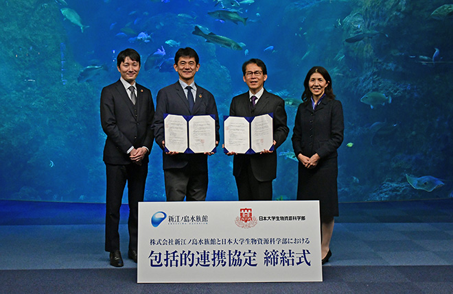 新江ノ島水族館と 日本大学生物資源科学部 は、相互の人的・物的資源を有効に活用し、教育・研究の充実、海洋生物保全活動の推進、地域社会への貢献および職員・学生生徒等の資質向上を図るため、広範な分野において連携及び協力を推進することを目的とした包括的連携協定を締結、2026年 1月 29日(木)に締結式をおこないました。