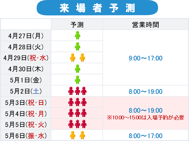 ・ 5月 3日(祝・日)、5月 4日(祝・月)、5月 5日(祝・火)の 10:00~15:00 のご入場は、入場券などのほかに、WEBでの入場予約が必要です。
