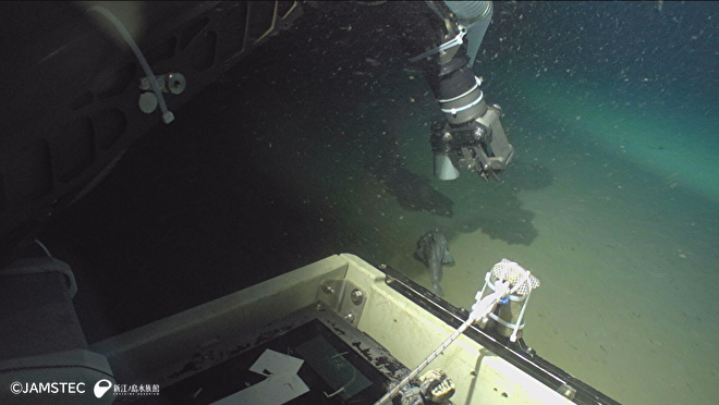 「クラムボン」#56 潜航は、南伊豆南西沖水深約 930mから 880mまでの観察・採集を実施し、「KM-ROV」ではきのうと同じ、西伊豆東方沖水深約 750mから 670mまでの観察・採集を実施し、同時に「Cave Cam」を回収しました。
