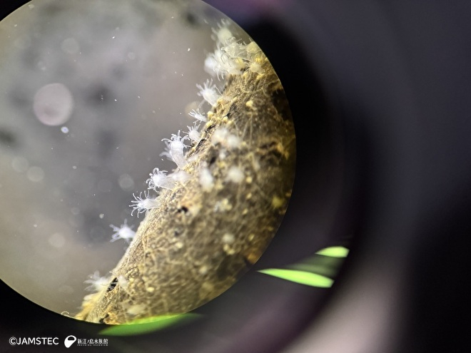 飼育下でも水中ドローンで採集したシンカイコシオリエビ類が、沈木に寄り添う姿が観察されています。彼らは沈木やそれに付着する生物を食べていたり、あるいは沈木から滲み出る硫化水素を利用していたり、何らかのかたちで沈木に依存しているものと思われますが、その明確な理由は分かりません。