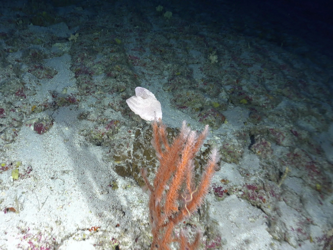 4本の潜航の観察結果としては、水深 100m を超える海底でも浅場の魚が普通に見られる一方で、ハナダイ類など深海性の魚も混在しているという印象です。