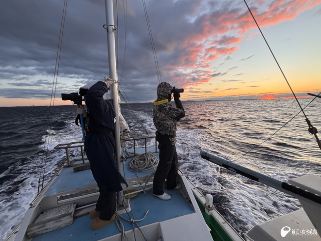 そんな出港直後は暗すぎて目視調査どころではありません。空が明るくなるまで、しばらくは待機時間。エンジン音を聞きながら、じっと夜明けを待ちます。