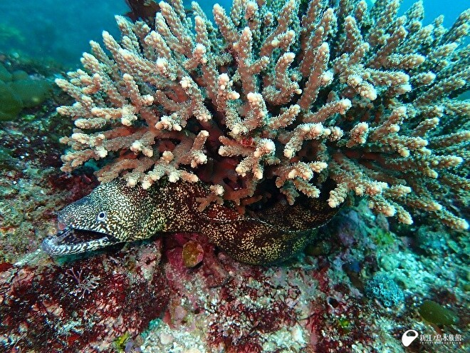 ニホンアワサンゴ魚はネンブツダイやクロイシモチなど城ヶ島や江の島でも見られるような種でしたが、ダイバーが接近すると、サンゴの枝の間に身を隠し、うまくその環境を活用して身を守っています。そのため、写真を撮る側としては難易度が高くなってしまいました。一緒に潜った藤田トリーターが大好きなウツボもサンゴをうまく活用していました。そんな藤田トリーターはもちろんウツボを見つけるたびに撮影タイムです。